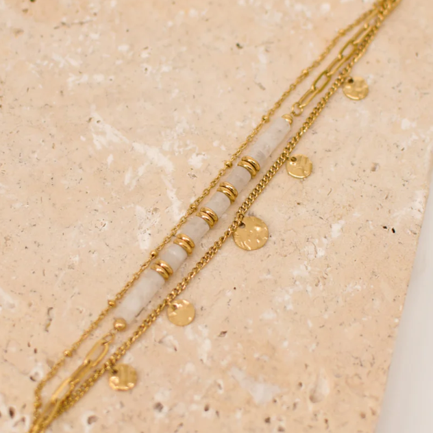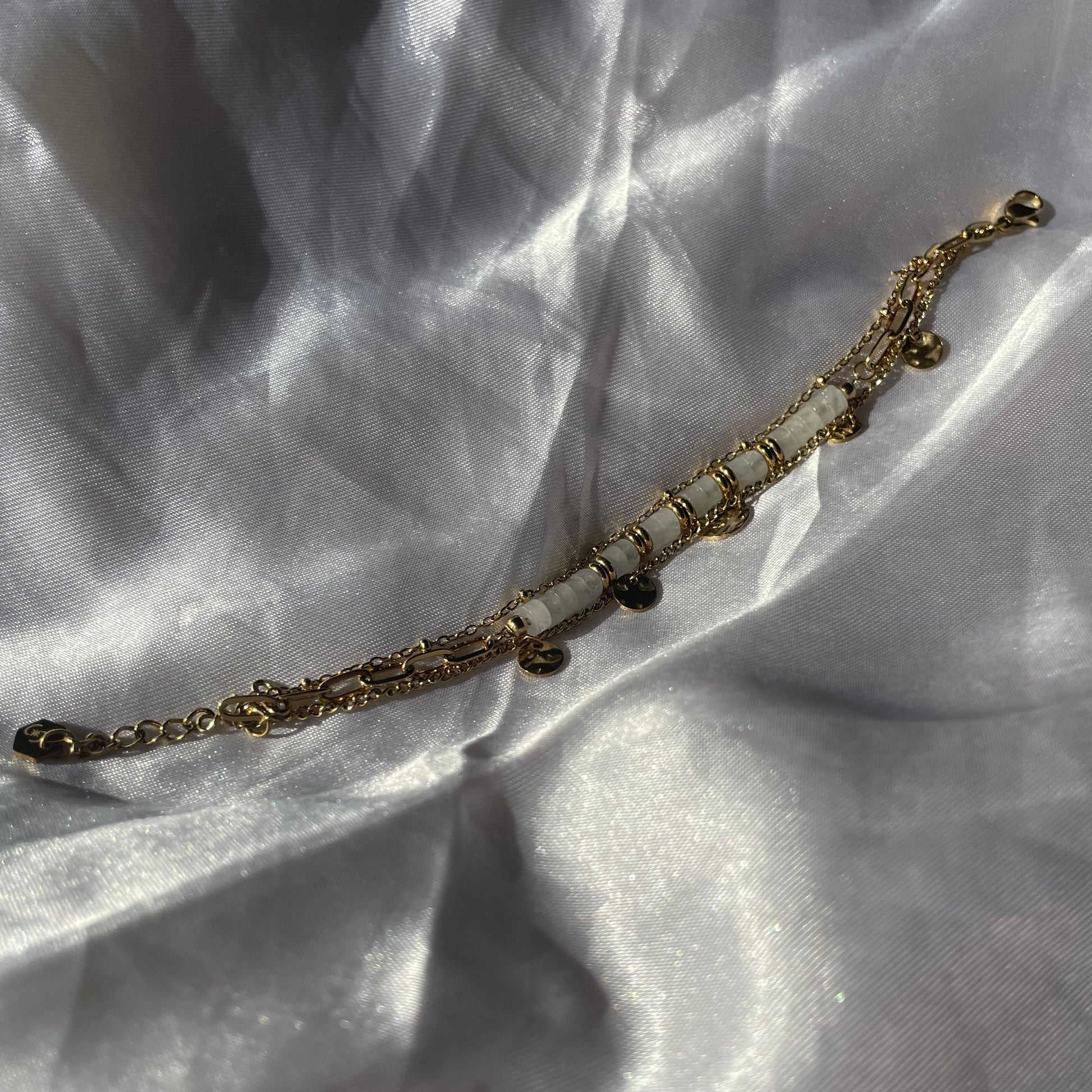 Le bracelet Lyra est un véritable porte-bonheur. Ses trois chaînes représentent l’harmonie des forces de vie, soutenues par la pierre de jade blanc qui attire les énergies positives et les opportunités. Les détails dorés et les croissants martelés rappellent que la chance est cyclique et qu’elle se construit dans les petits instants du quotidien.